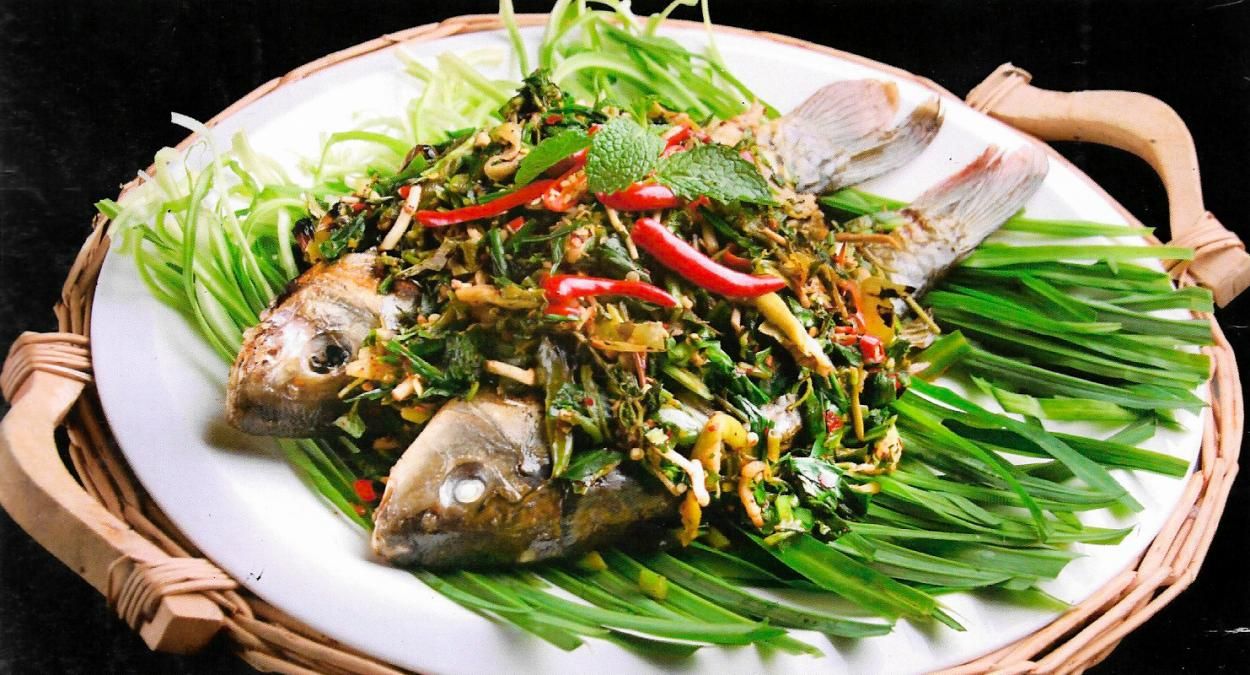 稻花鱼是在插完秧以后把鱼苗放进稻田里进行鱼稻互养。鱼儿吃着稻花长大,鱼肉具有一种天然的稻花香味,肉质嫩滑,口感清甜。烧鱼是榕江侗族人民最喜爱吃的美味佳肴之一。具体做法是:先把火烧旺(用炭火最好),用一根木棒削尖两端,将一端插进鱼嘴里,把另一端挨近旺盛的火堆插入土中,置于火旁烘烤,并常翻转,直至将鱼皮烧到黄色或略带焦色。当鱼全部烧好后,就把鱼肉剥下放在木盆或瓷盆中,取出鱼的大刺,用筷子将鱼肉插碎,把配料置于火上烧至七八成熟,切细,与生姜、大蒜、盐、花椒面一同和鱼肉拌匀,便成了香甜鲜美、味道奇特的侗家烧鱼。