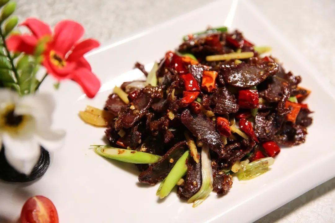 香辣牛干巴是以贵州小黄牛为主料,加上干辣椒、花椒、芝麻炒制而成的一道菜肴,味道麻辣鲜香,嚼劲十足,让你吃上一口就难以忘怀。