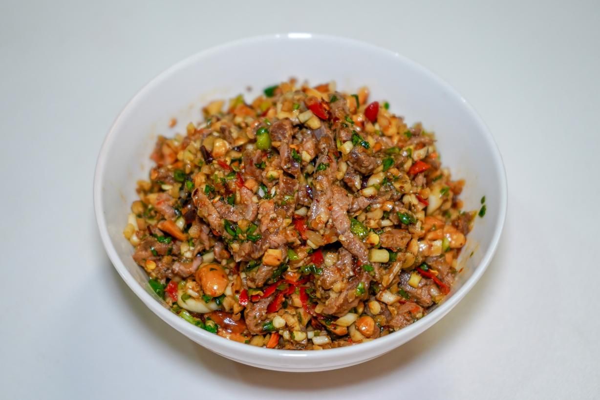 采用贵州本地小黄牛里脊肉,烤制八分熟,然后切成肉丝,拌上辣酱,香菜,花生碎的食材调味,加入灵魂芥末拌匀,这道菜在榕江可是下酒佳品!口味一绝!
