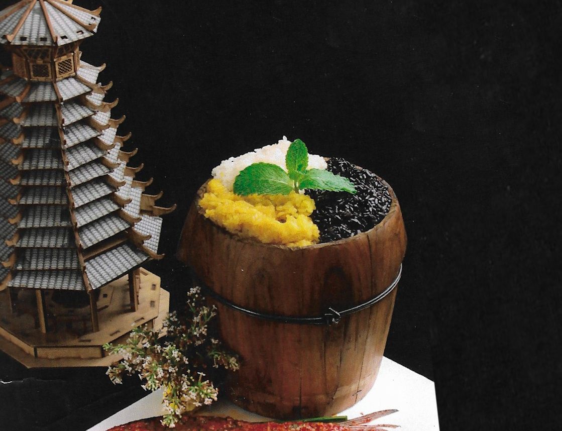 用黑、黄两种天然植物(黄米饭花、黑米饭叶)浸泡糯米,与原汁原味的糯米一起上锅蒸熟,黄色、黑色和白色组成了这独具特色的三宝姊妹饭,是民间祭祀或少数民族节庆必备佳品。