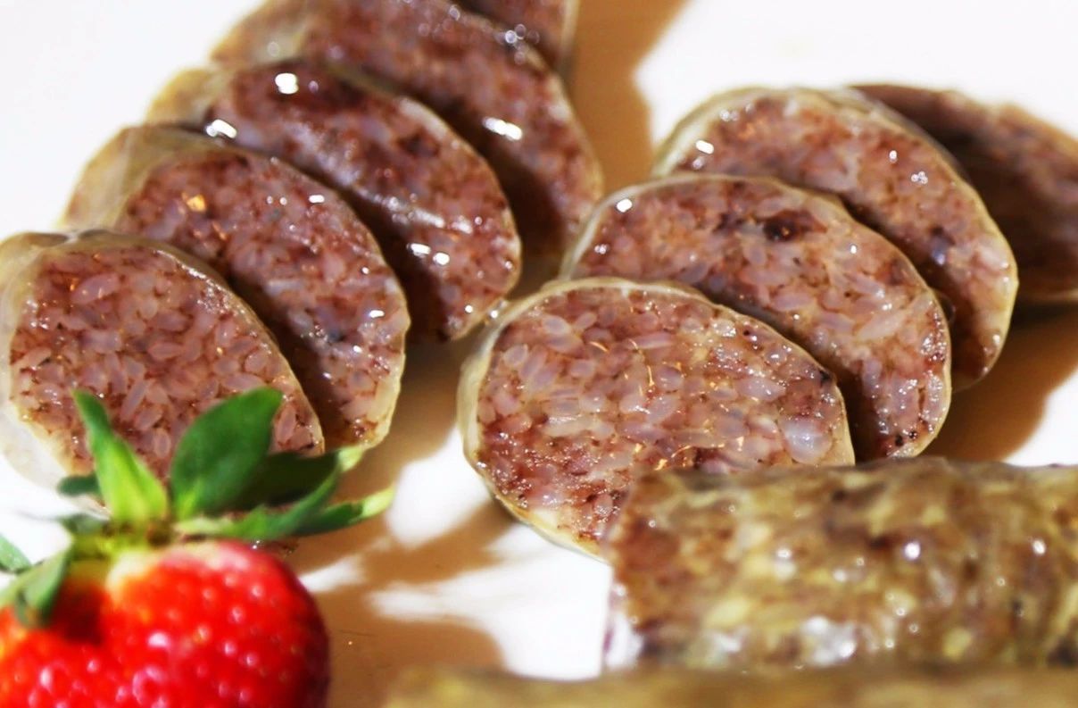 血灌粑的主料为糯米、猪肠、热猪血。血灌粑色泽黑红鲜亮,其味腊麻香软,有荤有素,营养丰富,腻而不沾,为下酒佐餐之佳品。