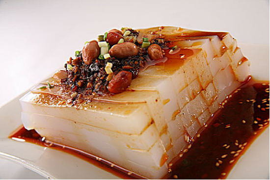 凉粉的制作方法:锅中加入凉水,烧开备用。在瓷盆中加入凉水,将当地出产的新鲜豌豆粉或土豆粉适量加入,边加入边快速搅拌,以防止粉面结块,搅拌至混合物黏稠成糊状时,将锅中开水用中火加热,慢慢将粉面糊注入开水,并不停搅拌,直至粉面糊完全由白色变成淡青色时,再稍微加热一会,至粉面糊完全熟透,盛入瓷盆等容器中,晾凉至凝固。气温不同,用时不同,常温下一般需要5-6小时。为了让凉粉快速变凉,也可在盆中加入半盆凉水,然后将盛凉粉的容器放入凉水盆中,待凉粉用手压试时非常有弹性、完全凝固成果冻样时,便可食用了。食用时可将食醋、清油、盐、鸡精、小尖椒圈、熟花生碎、豆瓣酱、豆豉、蒜泥、葱花、姜粒等调味品按一定的比例调成料汁,再将凉粉切成指头粗细长条码入盘中,浇上调好的料汁,最后点缀少量炒韭菜或葱花,一道绿白相间、酸爽美味、口感劲道的凉粉就可以上桌了。