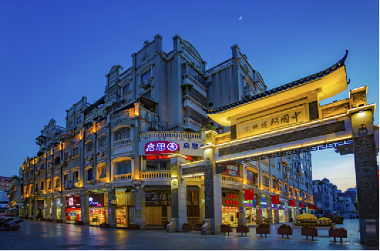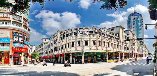 1897年广西梧州开埠后,商贾云集,梧州成为珠江流域著名的商埠,开始出现骑楼建筑。梧州现存骑楼建筑主要分布在河东老市区,共有骑楼街道22条,总长7公里,最长的达2530米,骑楼建筑560幢,其规模之大、数量之多,国内罕见,是名副其实的“中国骑楼博物城”。骑楼临街外墙上的铁环和水门,是梧州骑楼的特殊标志。骑楼城内代表性建筑有新西旅店、交通银行等。