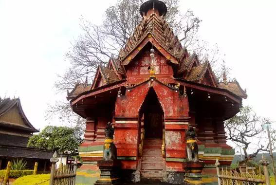 景洪傣族佛寺在造型上以重檐歇山式屋顶为突出的重要特征,整个屋顶建成了曲线的形式,中间凸起,再向两侧分成三一五段逐渐降低,形成轮廓变化丰富, 使得佛寺壮观而华贵。