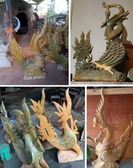 景洪傣族的佛寺土陶用品可以归纳为两种,建筑用品和祭祀用品。屋脊神兽属于佛寺用品建筑用品,基本上都是男性制作。现在为止,西双版纳做屋脊神兽的艺人已经寥寥无几,据初步考察,现在还在坚持制作佛寺上的陶制屋脊神兽的只有景洪市曼阁村岩罕滇、玉章凤和勐海县勐遮镇景真村岩光罕、岩温教、岩说五个人。