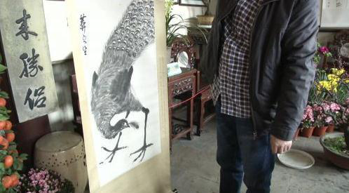 画卷一展开,就让人感到眼前一亮。这幅画全程用的墨,跟其他的不同。一般画孔雀,要么就是开屏,要么就站立着。但是图中的孔雀是在回头,两个脚张力非常大,而且这个羽毛往上竖。这个羽毛画出来的墨色就像芜湖铁画,有一种金属的感觉,而且有动感,好像这个孔雀尾巴一摆,身子会啪啦啪啦响。