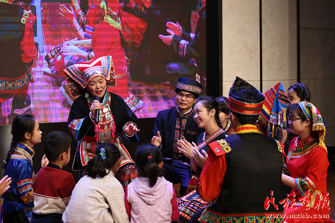 湖南省江华瑶族自治县《盘王大歌》国家级传承人赵庚妹(左,后)在瑶族优秀传统文化传习大会上,教学生们唱瑶歌