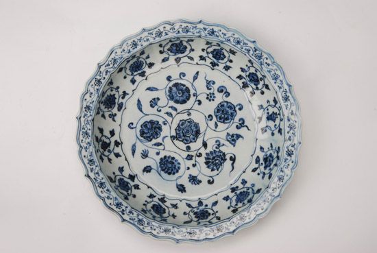 盘作菱口,折沿,浅壁瓜棱腹,广底,圈足。青花绘画纹饰,折沿面饰卷枝莲纹边饰,内外壁盘分别绘画卷枝莲花纹和折枝花卉纹,底心作卷枝花卉纹。该瓷盘属于中国青花瓷发展史上极盛时期的官窑产品,一是采用了郑和下西洋带回来的青花料——苏泥渤青料,点染出的青花易晕散,呈现出了中国画的韵味;二是瓷器手感极其柔滑,触摸上去就如婴儿肌肤般细嫩;三是做成花瓣形的盘沿,盘子里外都点缀了各式的花朵,颜色深沉的部分往胎骨里面凹,这是国产料没有的一种特点,只有官窑才能烧制出如此效果。